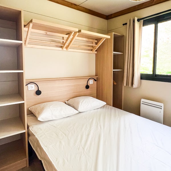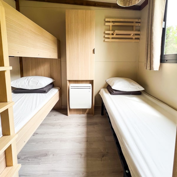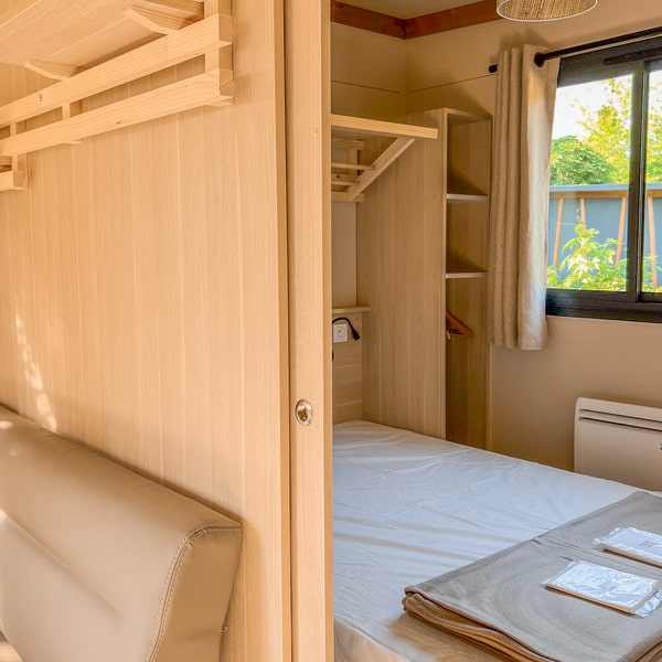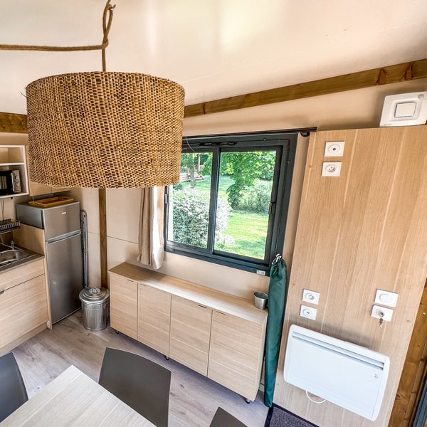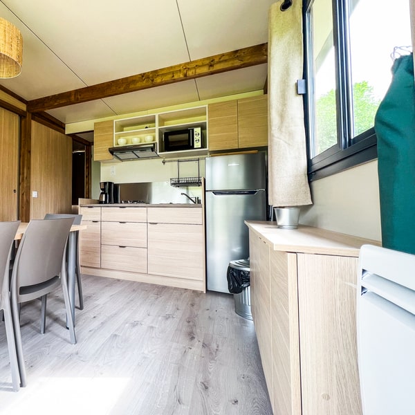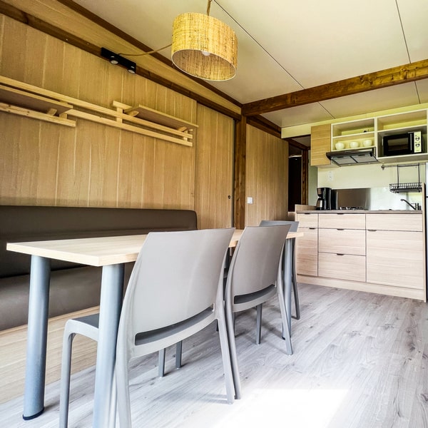 Cocon, confortable et tout équipé : ce chalet en bois vous invite à venir profiter en famille de l’ambiance camping, mais avec la petite note douillette en plus ! Profitez également d’une terrasse couverte avec une jolie vue sur la nature (parce que c’est bien plus sympa), idéale pour vos soirées à la belle étoile quelle que soit la saison !